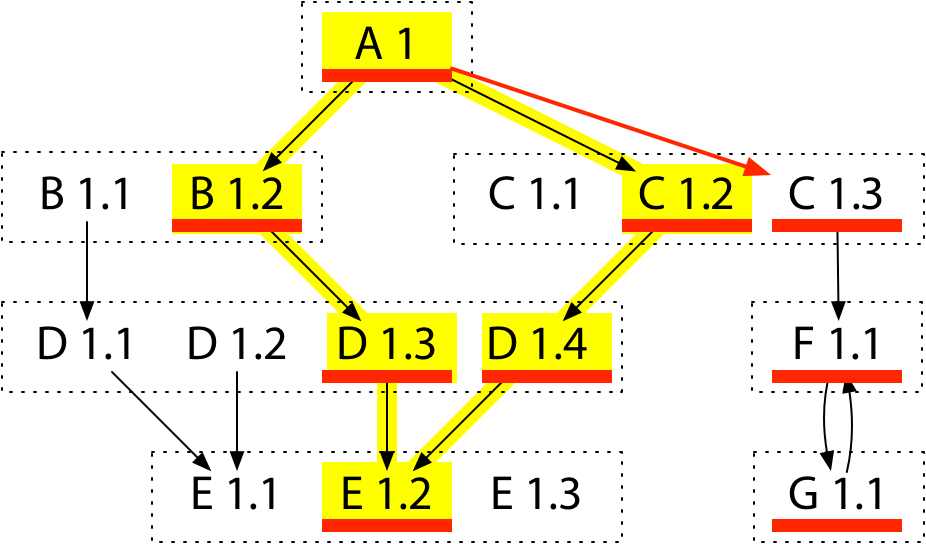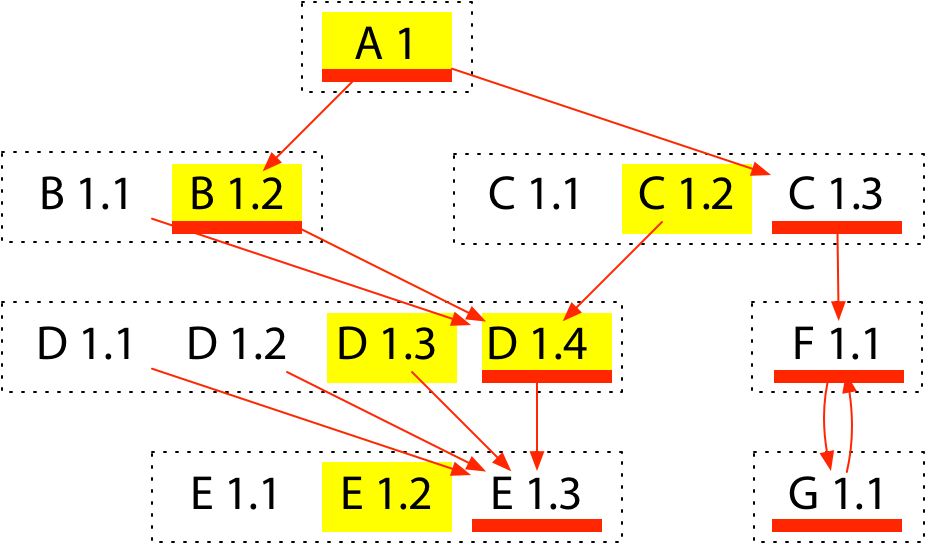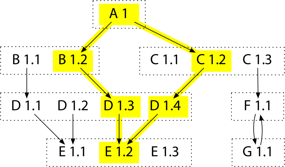 一个等效的, 更高效的构造基于图可达性. M 的粗略构建列表也仅仅是从 M 开始的后续箭头所需的所有模块的列表. 这可以通过对图的简单递归遍历来计算, 注意不要访问已经访问过的节点. 例如, A 的粗略构建列表是从 A 处开始并在高亮箭头后面找到的突出显示的模块版本.