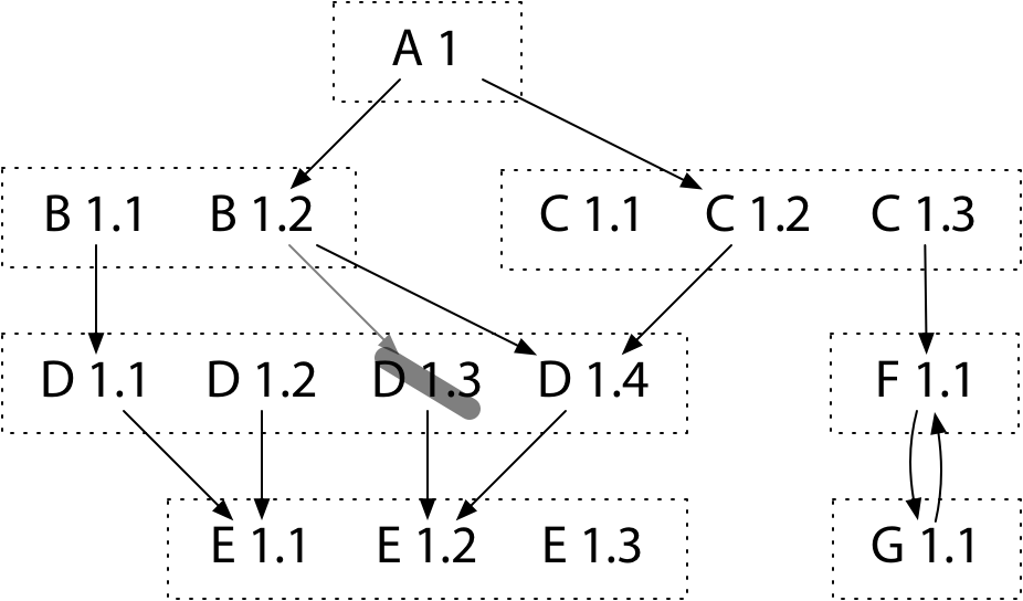 因为主版本是模块标识符的一部分, 所以我们必须知道我们正在处理 A 1 而不是 A 2, 但是 A 的确切版本未指定 - 我们的工作未发布. 同样, 不同的主版本只是不同的模块: 就这些算法而言, B 1 与 B 2 的关系不如 C 1. 我们可以用 A 2 到 A 7 替代图中的 B1 到 F1, 但明显损失很大, 但对于算法如何处理这个例子没有任何改变. 由于示例中的所有模块都具有主版本 1, 因此从现在开始我们将尽可能省略主版本, 将 A 1 缩短为 A. 我们目前的 A 版本需要 B 1.2 和 C 1.2. B 1.2 依次要求 D 1.3. 早期版本 B 1.1 需要 D 1.1. 等等. 请注意, F 1.1 需要 G 1.1, 但 G 1.1 也需要 F 1.1. 当单个功能从一个模块移动到另一个时, 声明这种循环可能很重要. 我们的算法不能假定模块需求图是非循环的.